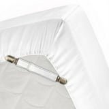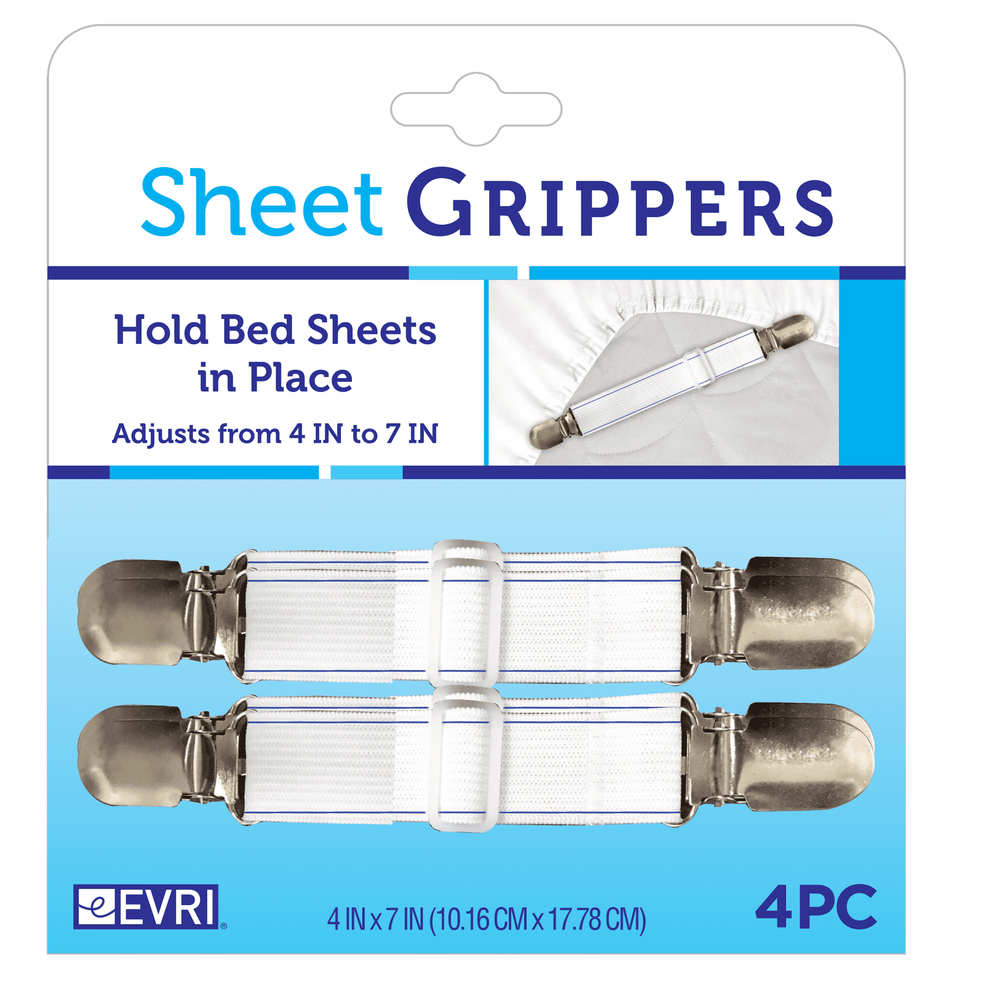 Product detailsEvri Metal Sheet Straps are made from durable elastic nylon material and includes a plastic, length adjusting buckle. Strong metal clamps ensure a secure grip on any sheet without damage. Holds any sheet in place without slipping. Straps are adjustable, 7.5 inches at its shortest length and 27.6 inches at its longest length, when using the plastic length adjusting buckle. Multi-use straps that can be used on blankets, ironing board covers, tablecloths, mattress pads, sofa cushions, chair covers, slipcovers, and tarps. Simple installment. Adjust straps to desired size, pull open clamp, place sheet into clamp, and clamp onto sheet. Repeat on every corner and stretch sheet over corners of the mattress. This item is a 4 pack to ensure secure hold on each corner of the sheet.Evriholder Sheet Gripping Straps that secure to sheet edges and hold sheets in place on the mattress.Turn flat sheets into fitted sheets. Use one sheet gripper per mattress corner.Place the bed sheet between the two plastic inner grips and press down on the metal piece to secure sheet.  Repeat for all corners.  4 Pack WhiteMade from quality elastic nylon material.Each strap is adjustable. 7.5 inches at its shortest and 27.6 inches at its longest.4 pack to secure each corner.