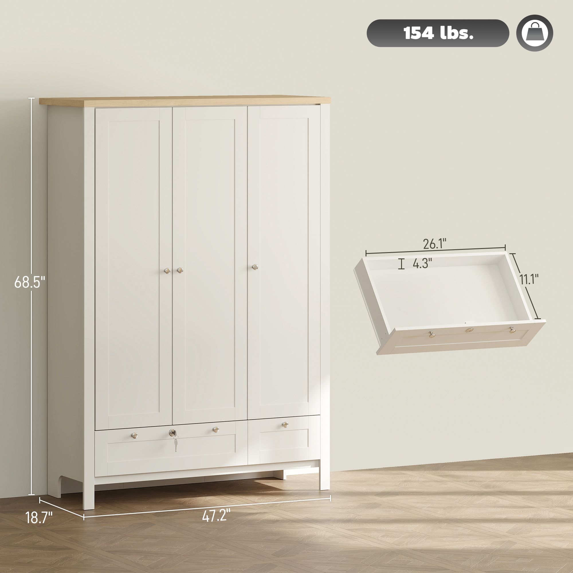 2.- Lockable Drawer: The large drawer of the armoire wardrobe closet comes with a lock and two keys-great for storing personal items like accessories, underwear, or important belongings discreetly and securely